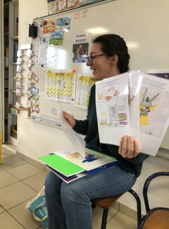 Julie de la médiathèque de Montaigu est venue préparer la venue de l’autrice et illustratrice Christine Roussey dans notre classe. Ce sera le 7 mai.